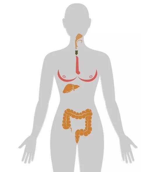酒精致癌,那是全面開花,如圖,從上到下哪哪都有。口咽、喉部、食道、乳腺、肝臟、結(jié)腸還有直腸,它都不放過。